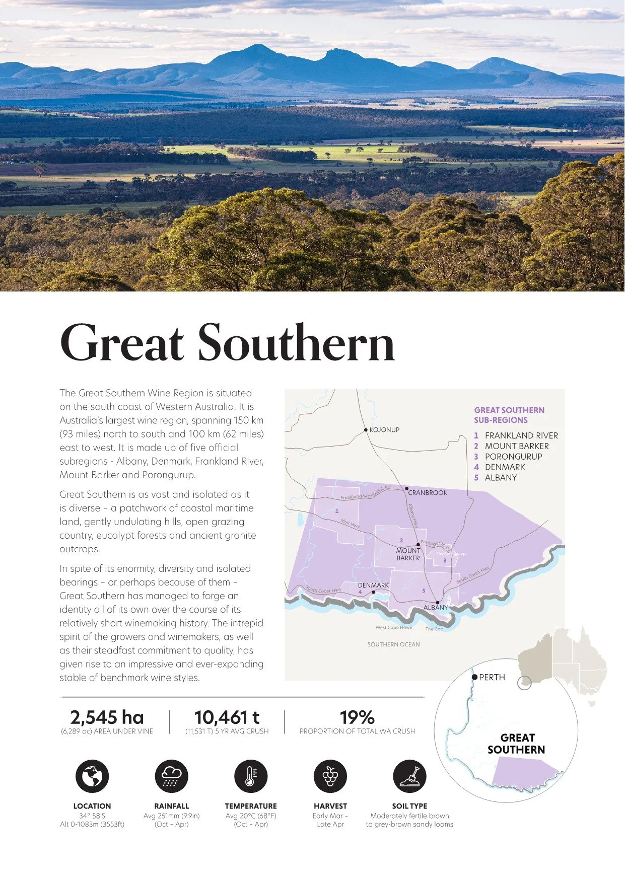 WA WINES TO THE WORLD has subsidised the development of a suite of information, tools and resources provided by Wine Australia, specifically highlighting the Great Southern Wine Region. Great Southern producers and stakeholders are encouraged to review all materials and adapt for their own presentations.